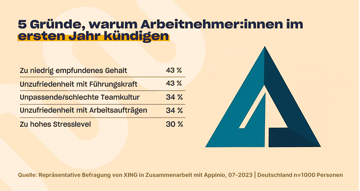 43 % der Arbeitnehmer:innen kündigen im ersten Jahr aufgrund von Unzufriedenheit mit der Führungskraft oder als zu niedrig empfundenem Gehalt. Weitere zentrale Gründe sind eine unpassende oder schlechte Teamkultur und zu hoher Stress.
